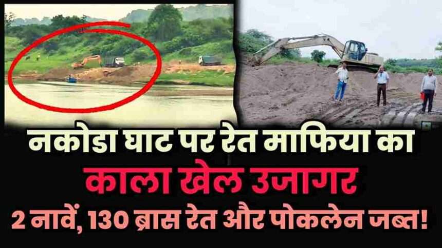 Illegal Sand Mining | नकोडा रेत घाट पर अवैध खनन का पर्दाफाश – SDM और तहसील टीम की बड़ी कार्रवाई, 2 नावें, रेत व पोकलेन जब्त!